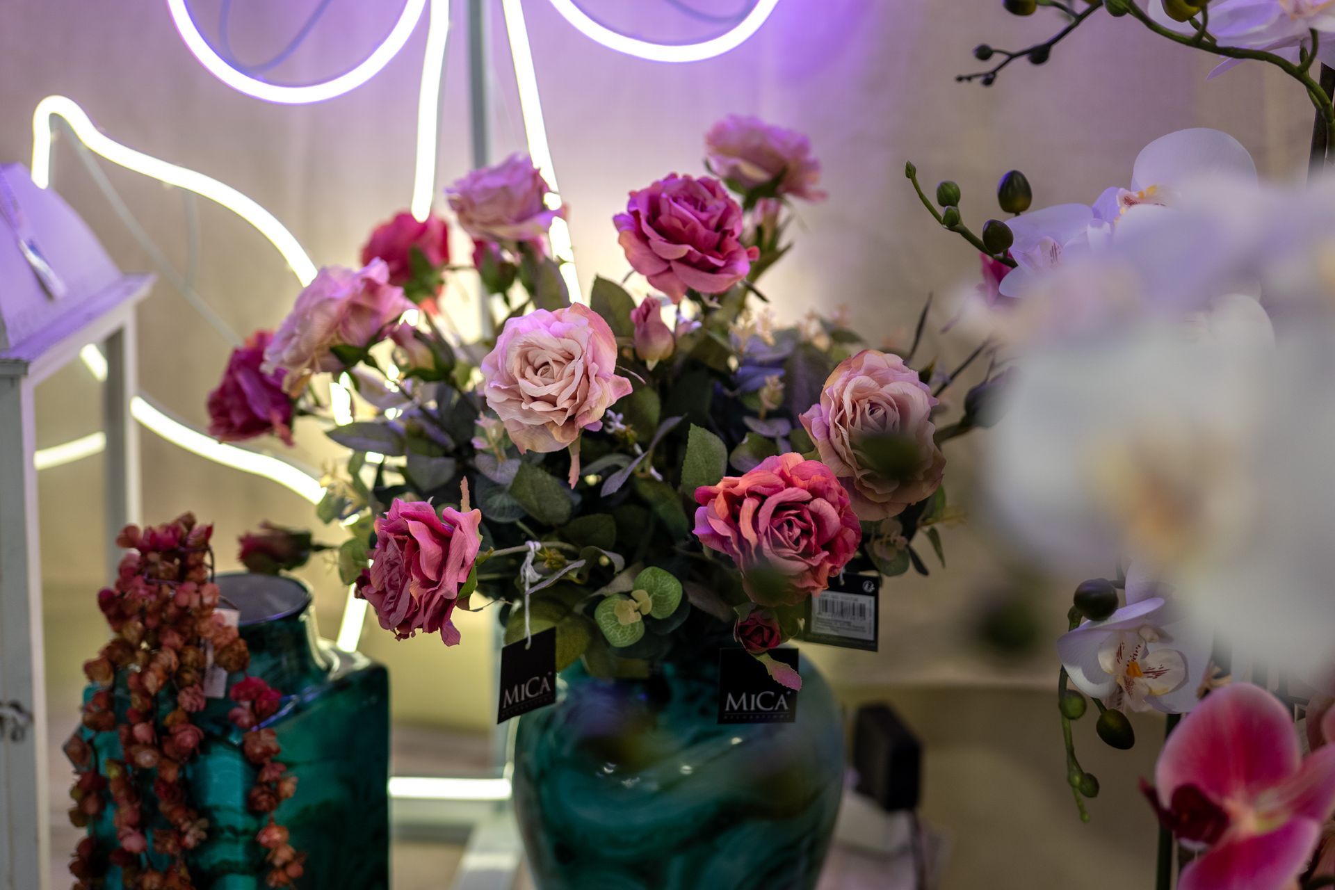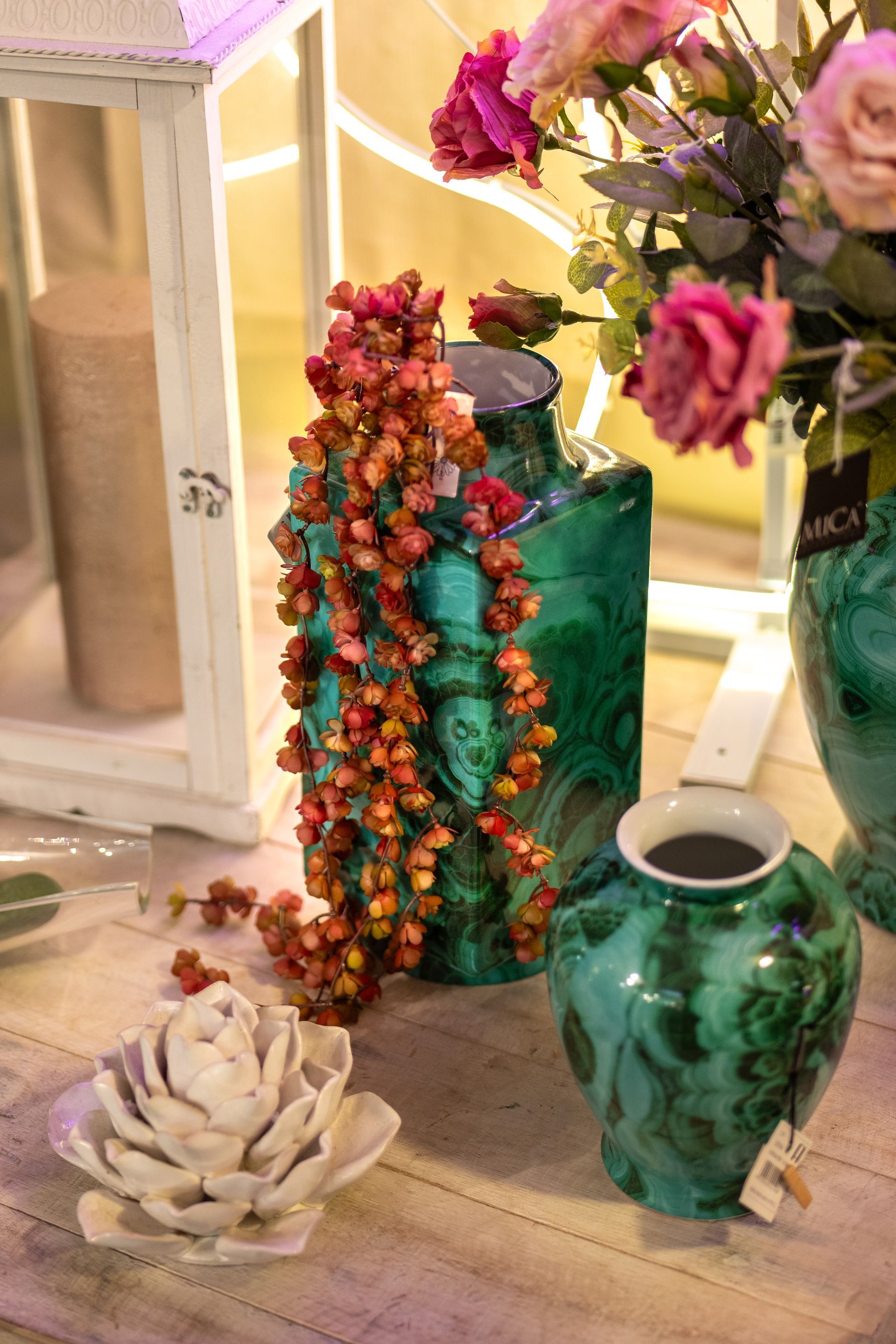 Complementi di arredo, composizioni floreali di qualità, vasi, cristalli, lanterne e divani